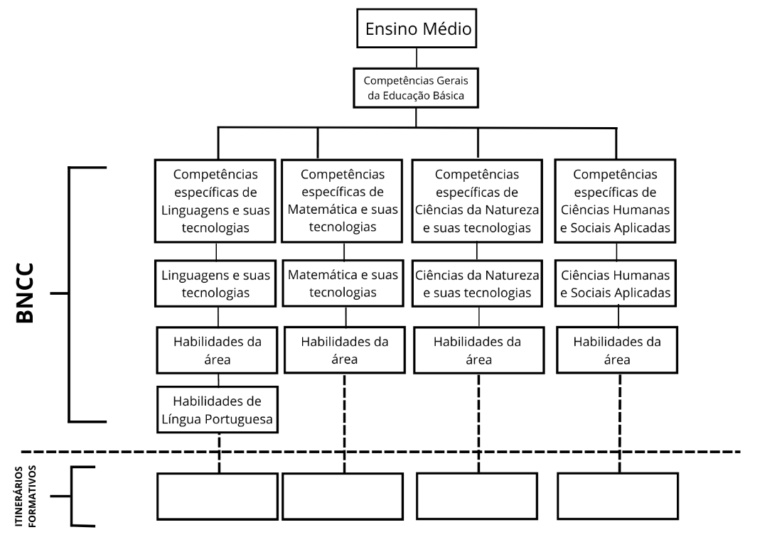 Para cada uma das competências específicas são descritas habilidades, sendo que a Língua Portuguesa e a Matemática são os únicos dois componentes obrigatórios do Ensino Médio.