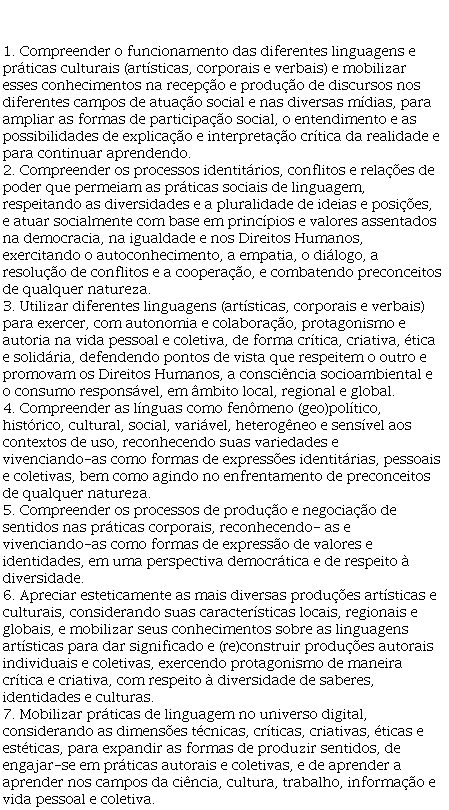 Compreender as línguas como fenômeno (geo)político, histórico, cultural, social, variável, heterogêneo e sensível aos contextos de uso, reconhecendo suas variedades e vivenciando-as como formas de expressões identitárias, pessoais e coletivas, bem como agindo no enfrentamento de preconceitos de qualquer natureza (BRASIL, 2018, p. 490)