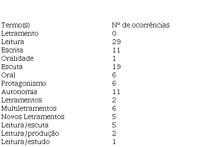 Na segunda etapa, verificou-se o número de ocorrências do termo letramento e outros que a ele associamos, a partir do quadro teórico dos NEL. A seleção inicial contou com os seguintes termos: letramento, letramentos, oralidade, leitura, escrita, multiletramentos e novos letramentos. No decorrer da análise, outros termos se mostraram relevantes para o quadro teórico: protagonismo e autonomia (cf. Quadro 2).