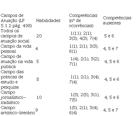 Desta forma, retomando a análise, é de salientar a ausência de uma competência, na maior parte da etapa do Ensino Médio, que mencione, pelo menos, o olhar crítico dos alunos sobre a língua e a linguagem, uma vez que ela está presente apenas em três habilidades que pertencem a todos os campos de atuação (cf. Quadro 3).