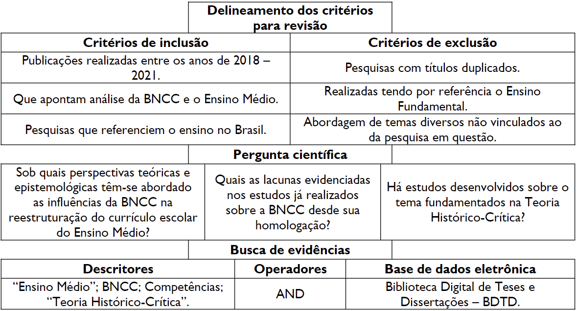 Considerada como parte de uma pesquisa de Mestrado em Educação que tem como objeto de análise a BNCC do Ensino Médio (BRASIL, 2018), a presente Revisão Sistemática é apreendida em seu caráter empírico como subsidio teórico que visa atestar ou refutar a relevância científica e social da pesquisa da qual é parte, bem como a necessidade de se desenvolver discussões sobre o tema proposto em sua totalidade via análise e interpretação dos resultados obtidos. Por conseguinte, a determinação dos descritores aqui utilizados, assim como a base de dados escolhida e o período adotado, são igualmente justificados pelos fins ora retratados e pelo momento histórico em que a revisão se inscreve.