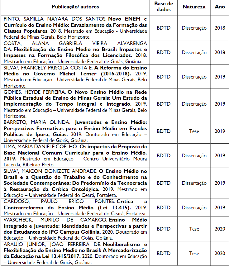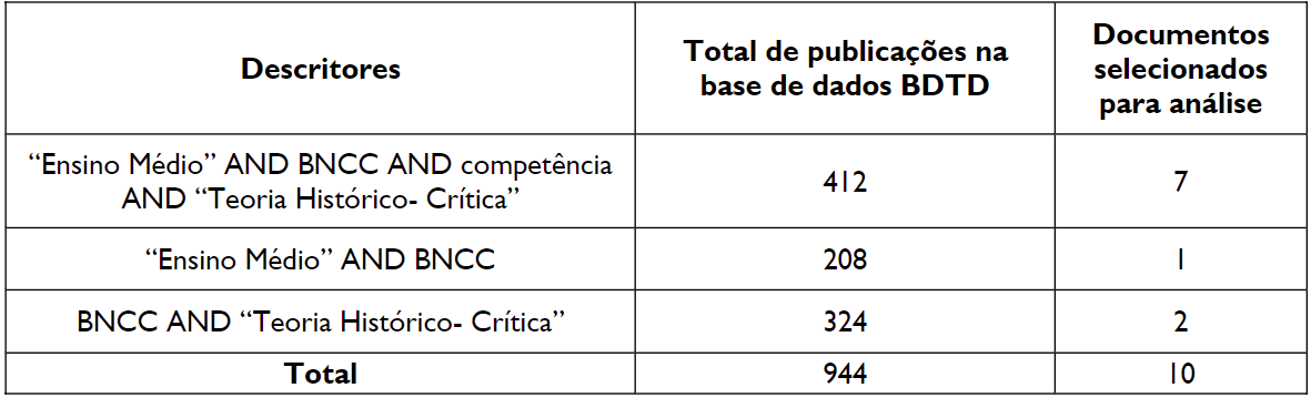 O Quadro 2 mostra que, do total de 944 publicações encontradas na Biblioteca Digital de Teses e Dissertações (BDTD) na utilização dos descritores “Ensino Médio” AND BNCC AND competências AND “Teoria Histórico-Crítica”; “Ensino Médio” AND BNCC; BNCC AND “Teoria Histórico-Crítica”, apenas dez foram selecionadas como as que mais se aproximaram do objeto de estudo, isto é, de discussões concernentes à reforma da BNCC do Ensino Médio.