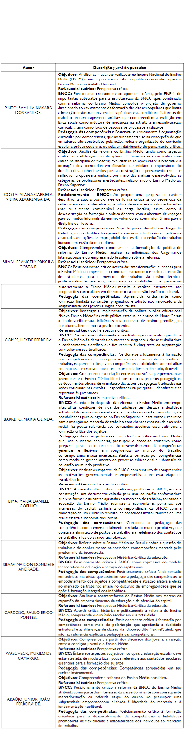 Com a finalidade de propiciar uma descrição geral das perspectivas adotadas nas referidas pesquisas que orienta os achados para posterior discussão, o Quadro 4 consiste na apresentação dos objetivos; do referencial teórico; do posicionamento dos referidos pesquisadores frente à reforma da BNCC do Ensino Médio e igualmente frente à pedagogia das competências, atualmente estruturante da nova organização da BNCC (BRASIL, 2018). A explicitação se efetiva considerando a mesma ordem de exposição dos autores adotada no Quadro 3.