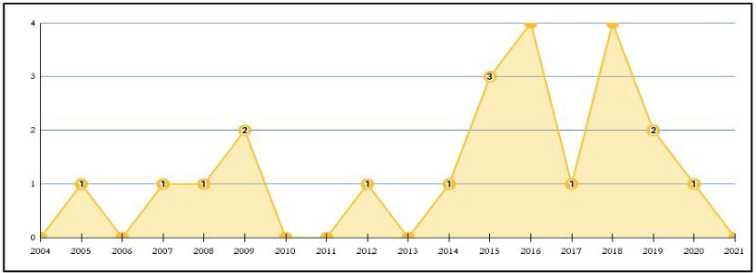 É sabido como grupos de pesquisas e eventos científicos impactam a produção da comunidade científica, as trocas de saberes entre cada pesquisador impulsionam o conhecimento e lapidam seus trabalhos através de apontamentos e discussões. Dessa forma, a existência de barreiras físicas, temporais e linguísticas podem dificultar essas trocas. O Gráfico 1 mostra um aumento expressivo no fim da década, podendo indicar um crescente interesse nesta área, desenvolvendo-se por conta do aperfeiçoamento das tecnologias e também da sua aplicação na educação, possibilitando uma análise quantificada da percepção visual dos indivíduos.