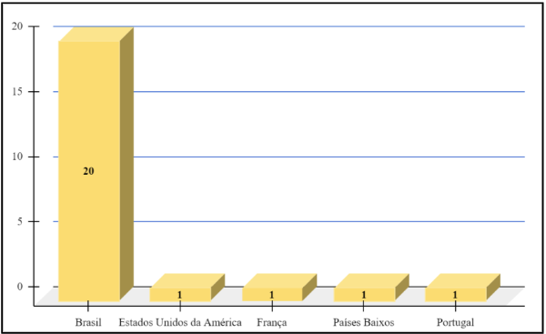 Como consta no Gráfico 2, as pesquisas encontradas apontam um polo brasileiro que vem se desenvolvendo na área. É fundamental destacar a limitação comum nesse tipo de revisão, visto que mesmo que o corpus inicial seja composto por 4231 documentos, possivelmente há trabalhos em outras plataformas e formatos. Sendo esse um indicativo baseado na nossa busca.