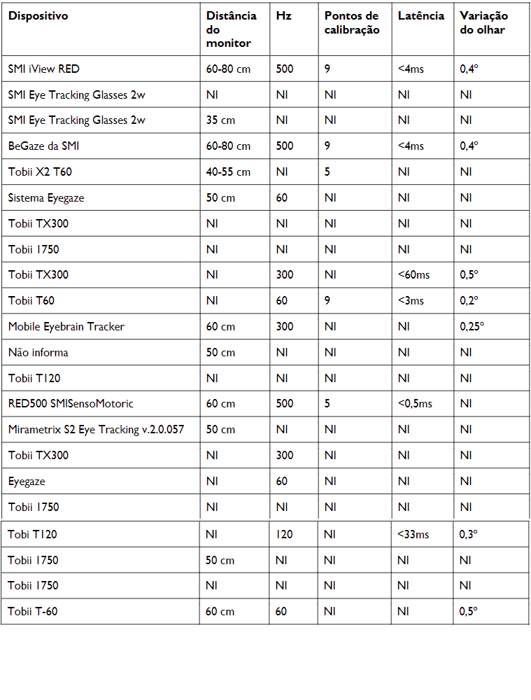 Fonte. Elaborado pelos autores, 2022.Fica claro com a tabela que ainda não temos protocolos e métodos na área, bem como ainda não temos normalização na exibição desses dados, de forma que cada trabalho registra o que considera necessário para a publicação. Tivemos o dispositivo utilizado como descrição mais comum, aparecendo em 95,5% dos casos, sendo em maioria (54,6%) o Tobii. Entretanto, havia uma ausência frequente (entre 50% e 77,3%) no registro dos outros dados, como por exemplo o parâmetro da variação na horizontal e vertical suportada pelos dispositivos, que foi relatado apenas nos trabalhos de Credidio (2012), Castanho (2018) e Christo (2019).