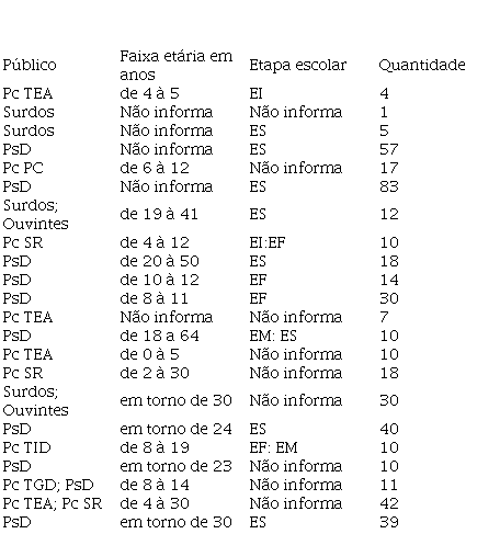 Quanto à caracterização dos participantes, os dados foram dispostos de maneiras diferentes, sendo identificado que: a) as idades eram exibidas em forma de médias, aproximações ou ainda em intervalos, seja eles grandes ou pequenos; b) a etapa escolar não foi registrado em 40,9% dos casos, no restante constava que 9,1% continham o público da Educação Infantil, 18,2% do Ensino Fundamental, 9,1% do Ensino Médio e 36,4% do Ensino Superior; c) as pesquisas com o público do AEE traziam o diagnóstico/laudos dos participantes para poder efetuar a caracterização, já nos outros trabalhos não era descrito se havia ou não pessoas deste grupo; d) não há presença de professores dentre os participantes.