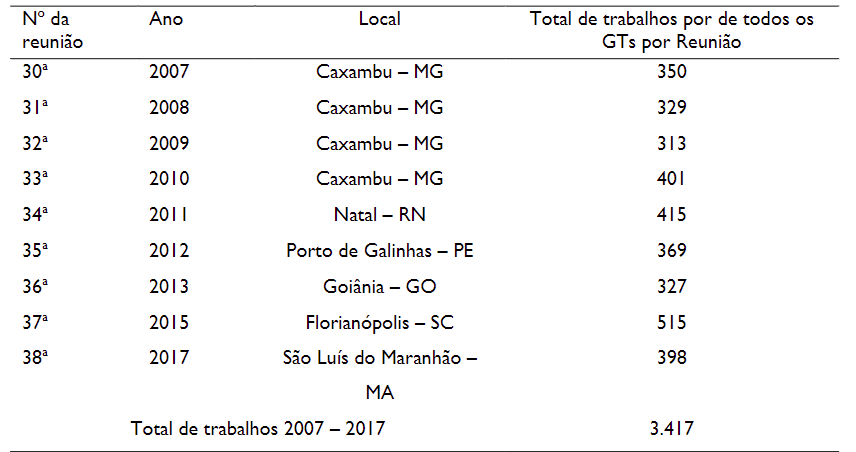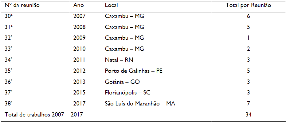Ademais, não há uma estabilidade no índice de trabalhos publicados sobre a temática a cada ano. No ano de 2007, foi um total de 6 trabalhos publicados, enquanto no ano de 2008 apenas 5. Em 2009, houve uma queda extrema, reduzindo-se a 1 trabalho. O ano de 2010 apresentou um pequeno aumento, com um total de 2 trabalhos. Já em 2011, o índice aumentou para 3 trabalhos e, no ano de 2012, 5 trabalhos. Nos anos de 2013 e 2015, novamente ocorreu uma redução, totalizando 3 trabalhos. Em 2017, última reunião investigada, foi constatado um total de 7 trabalhos.