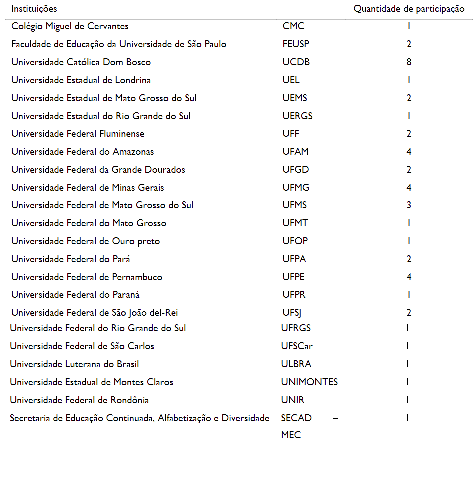 De forma geral, muitas das instituições que realizaram publicações não participaram assiduamente das discussões pautadas na “Educação Escolar Indígena”. Tal afirmação parte do pressuposto de que ao longo desse período cada instituição, como, a CMC, UEL, UERGS, UFMT, UFOP, UFPR, UFRGS, UFSCar, ULBRA, UNIMONTES, UNIR, SECAD – MEC, realizou apenas uma (1) publicação voltada para a discussão indígena. Enquanto as demais instituições apresentaram um pequeno aumento na contribuição para as discussões acerca da temática destacada. Verificou-se também que a contribuinte mais assídua nos debates foi a UCDB, o que pode ser atribuído à hipótese de sua localização, visto que a sede fica localizada no Mato Grosso do Sul, um dos estados com maior população de indígenas10, ficando atrás apenas do estado do Amazonas.