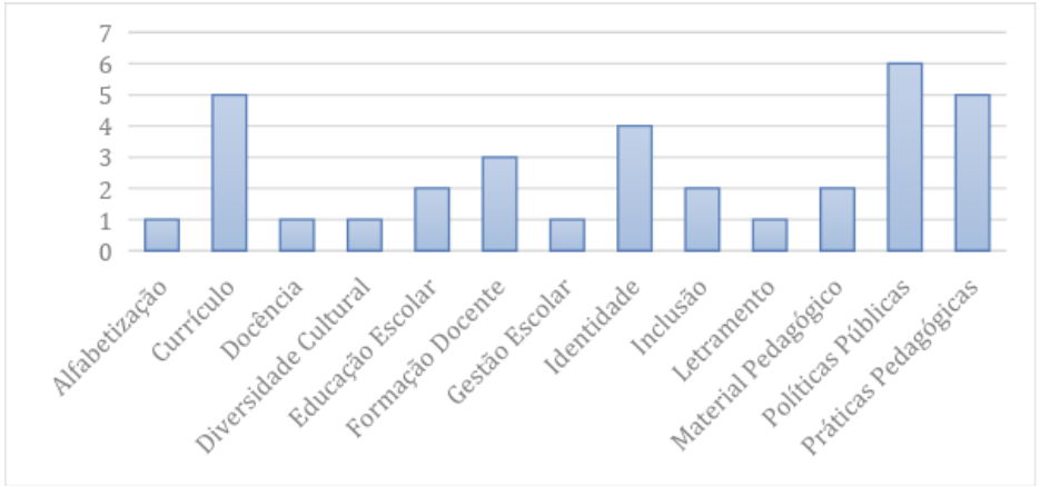 O Gráfico 1 mostra que os estudos com foco na educação escolar indígena se encontram distribuídos nas seguintes áreas de conhecimento: Alfabetização (1), Currículo (5), Docência (1), Diversidade cultural (1), Educação Escolar (2), Formação Docente (3), Gestão Escolar (1), Identidade (4), Inclusão (2), Letramento (1), Material Pedagógico (2), Políticas Públicas (6), e Práticas Pedagógicas (5).