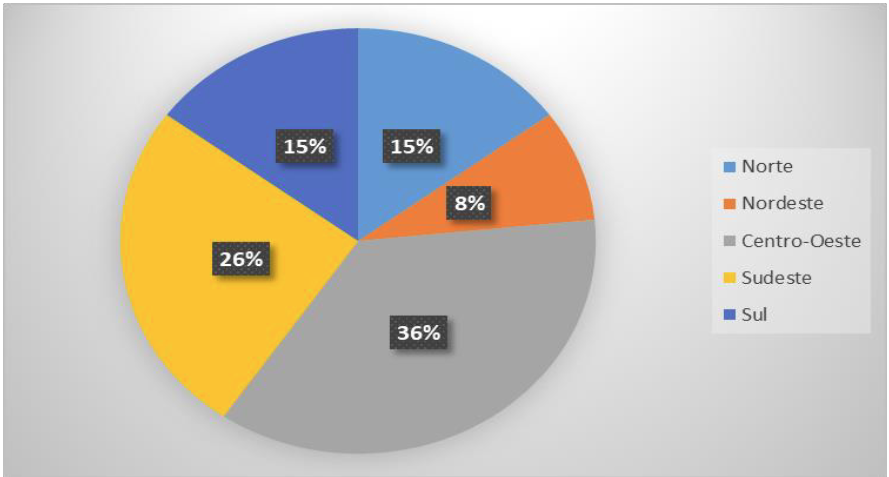 Conforme o IBGE (2010), outra região com expressiva população indígena é a Centro-Oeste, o que pode justificar o quantitativo de 36% das publicações partirem desta região.