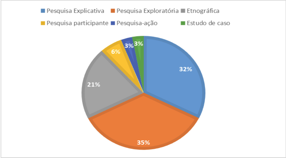 O Gráfico 3 exibe os tipos de pesquisa usados para o desenvolvimento dos trabalhos analisados. Nesse caso, as mais proeminentes entre as opções são a pesquisa exploratória (índice de 35%), a pesquisa explicativa (índice de 32%) e a pesquisa etnográfica (índice de 21%). Ainda são mencionadas a pesquisa participante (índice de 6%), a pesquisa-ação e o estudo de caso (ambos com um índice de 3%).