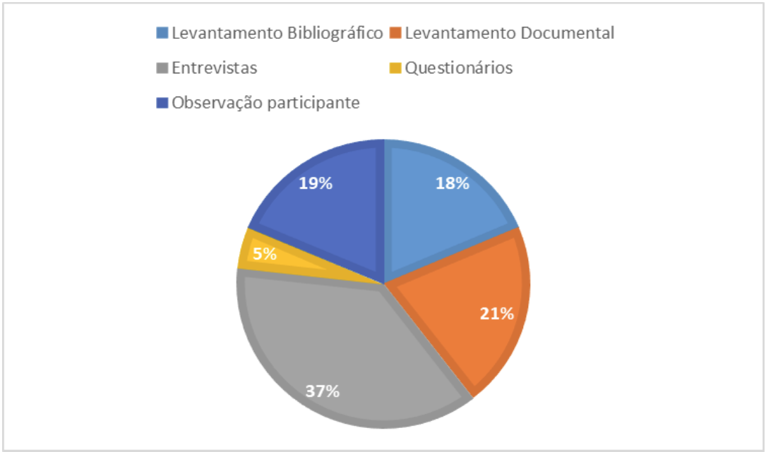 O Gráfico 4 revela o índice de cada procedimento metodológico de coleta de dados utilizado pelos pesquisadores. Nele, consta que as entrevistas representam um total de 37% dos procedimentos adotados pelos pesquisadores, seguidas pelo levantamento documental com 21%, a abordagem de observação participante com 19%, o levantamento bibliográfico com 18% e os questionários com 5%. Como mencionado, o procedimento mais utilizado pelos pesquisadores é a entrevista que, segundo Prodanov e Freitas (2013, p. 106), “é sempre realizada face a face (entrevistador mais entrevistado); também pode ou não ser realizada com base em um roteiro de questões preestabelecidas e até mesmo impressas”. Devido à natureza face a face, o pesquisador (entrevistador) pode colher informações que vão além das questões expostas ao informante (entrevistado), permitindo que o pesquisador aproveite falas que serão primordiais para um resultado mais completo e verídico.