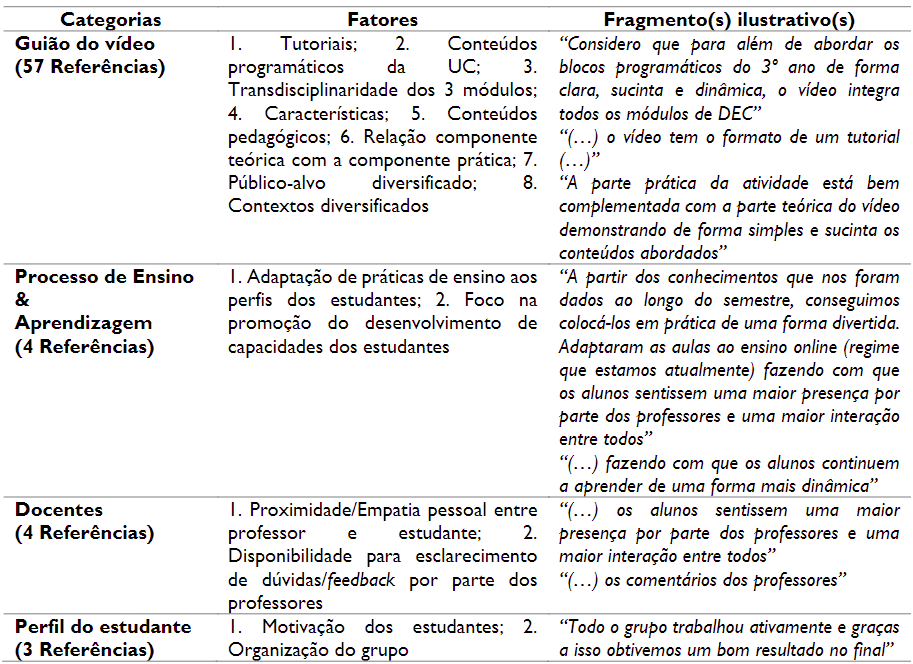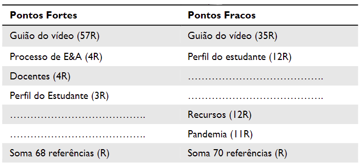 Segue-se uma exploração detalhada dos resultados emergentes deste processo. Na Tabela 1, encontram-se explicitadas as categorias identificadas como estando associadas às dimensões Pontos Fortes e Pontos Fracos. No total foram identificadas quatro categorias como Pontos Fortes, designadamente: “Guião do vídeo”, “Perfil do Estudante”, “Processo de Ensino & Aprendizagem” e “Docentes”. No que respeita aos Pontos Fracos foram identificados um total de quatro categorias, designadamente: “Guião do vídeo”, “Perfil do Estudante”, “Recursos” e “Pandemia”.