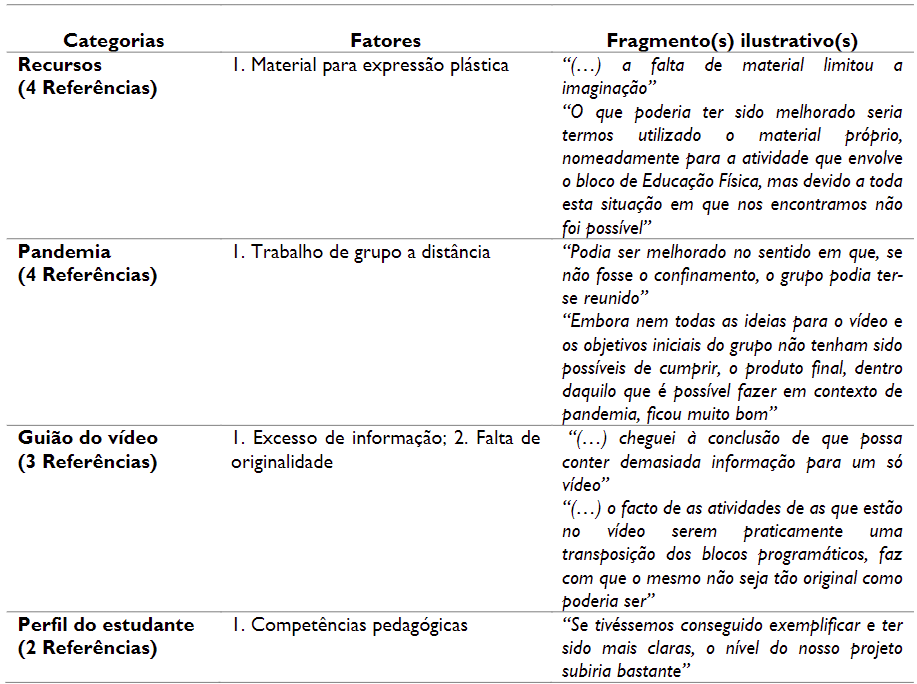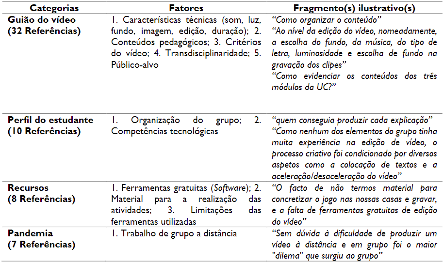 Nas dificuldades apontadas pelos estudantes, foi possível identificar quatro categorias: ‘Guião do vídeo’, ‘Perfil do Estudante’, ‘Recursos’ e ‘Pandemia’. A categoria ‘Guião do vídeo’ engloba fatores, sobretudo associados aos conteúdos pedagógicos a privilegiar e a características técnicas de elaboração do vídeo tais como som, luz, imagem, duração, edição. Por sua vez, à categoria ‘Estudantes’ estão afetos fatores relativos às competências tecnológicas e de organização do grupo. A categoria ‘Recursos’ encerra fatores tais como o acesso a materiais para a realização das atividades propostas bem como os relacionados com a ausência (ou desconhecimento) de ferramentas de software gratuitas e com as respetivas limitações. Também a categoria ‘Pandemia’ é apontada, novamente, como um fator constrangedor, obrigando a realização de trabalhos em grupo a distância.