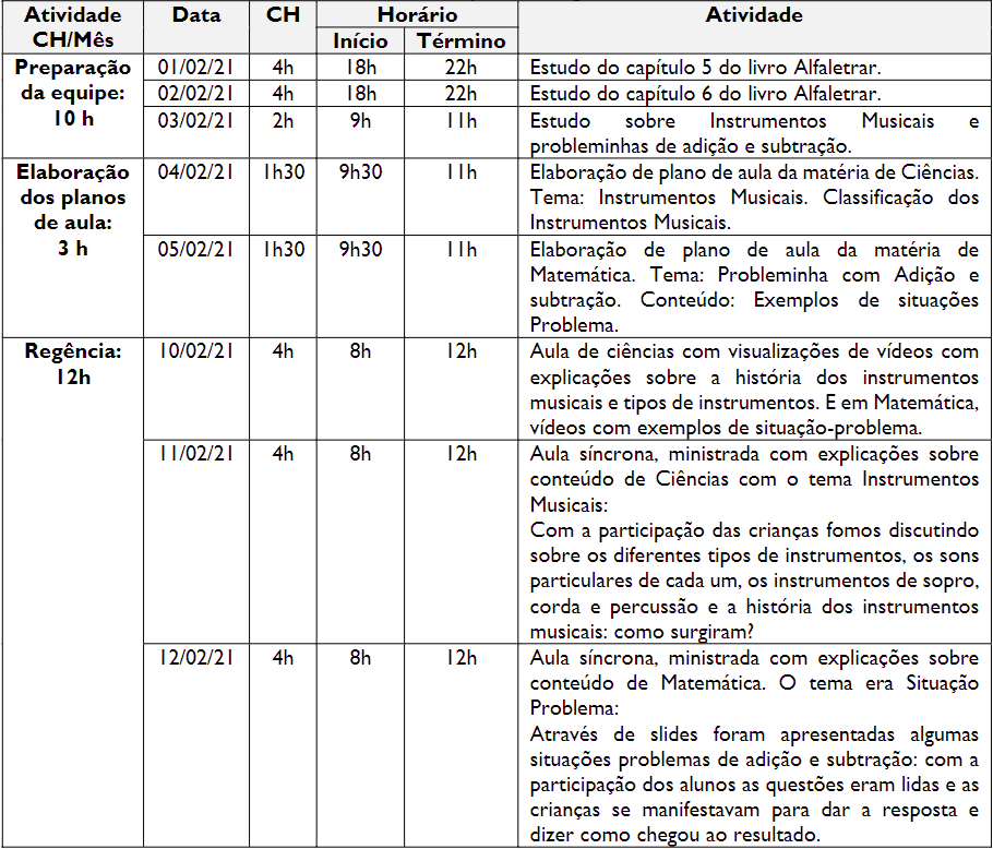 Conforme o exposto, as estagiárias e residentes participaram dos planejamentos pedagógicos durante os períodos de observação e regência e mantiveram contato efetivo com todas as ações de ensino que aconteceram, na modalidade remota, durante o estágio curricular.