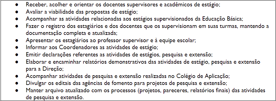 De acordo com o Regimento do Colégio de Aplicação, o acompanhamento do estágio é realizado por meio da Coordenação de Estágio, Pesquisa e Extensão (CORDEPE) que tem como objetivo promover o aperfeiçoamento e o desenvolvimento de ações de extensão, bem como a ampliação do campo de estágios e pesquisa no âmbito da Educação Básica. Para isso, visa o estreitamento entre as relações com os demais cursos e órgãos superiores de pesquisa e extensão da Universidade Federal de Roraima e de outras instituições de ensino superior. O quadro 2 apresenta algumas das atribuições da CORDEPE: