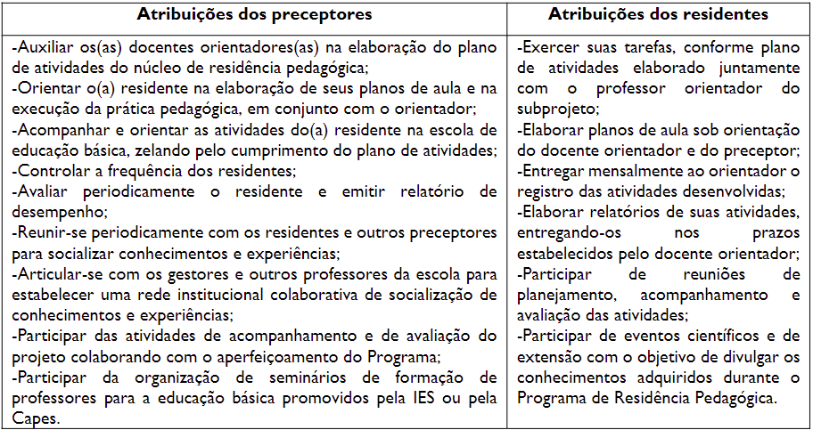 Nesse Programa há duas definições importantes: residente e preceptor. O residente é o discente com matrícula ativa em curso de licenciatura e o preceptor é o professor da escola de educação básica responsável por planejar, acompanhar e orientar os residentes nas atividades desenvolvidas na escola-campo. O quadro 3 apresenta algumas atribuições dos residentes e dos preceptores: