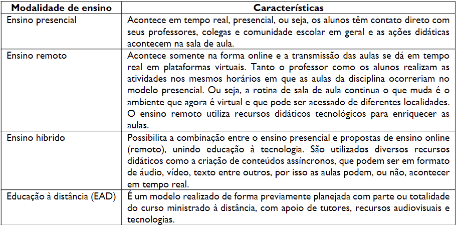 Dessa forma, as instituições de ensino, por meio dos sistemas educacionais, adaptaram carga horária, formatos de atividades e, especialmente, os meios para desenvolver atividades não presenciais como possibilidade para os alunos seguirem aprendendo, mesmo estando isolados em casa. Nesse sentido, em virtude da pandemia da COVID 19, o ensino presencial abriu espaço para outras modalidades de ensino-aprendizagem, como o ensino remoto, a EaD e o ensino híbrido. O quadro 4 apresenta algumas características dessas modalidades de ensino: