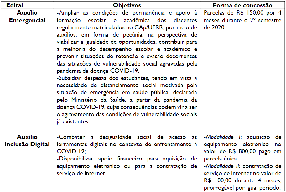 Em relação às questões digitais e tecnológicas a instituição ofereceu cursos aos alunos e seus responsáveis para ensinar a manusear as plataformas educacionais adotadas, além de produzir guias e manuais de orientação. Quanto à acessibilidade, o CAp/UFRR abriu dois editais, um de Auxílio Emergencial e outro de Auxílio à Inclusão Digital que se desenvolveram da seguinte forma: