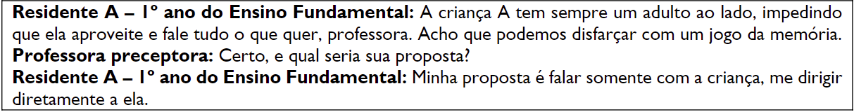 Nesse trecho, podemos perceber a reflexão da residente diante de uma demanda bem comum do ensino remoto: a intervenção familiar nas atividades. Outra estratégia sugerida e adotada pela residente foi “disfarçar” com um jogo, que na análise da acadêmica, poderia reduzir a ansiedade e, consequentemente, melhorar o tempo e a qualidade da reflexão da criança. É válido destacar que a observação da residente sobre as frequentes intervenções familiares estava registrada em seu diário de bordo, instrumento utilizado nas análises e reflexões acerca do ensino remoto.