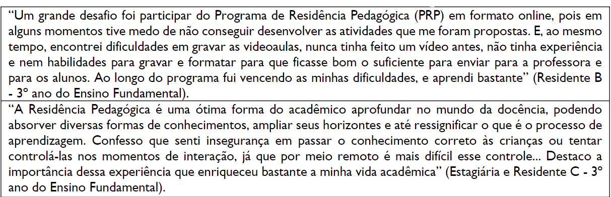 Também foi percebido nos relatórios o sentimento de insegurança quanto ao estágio na modalidade de ensino remoto. Conforme o quadro 7, o medo foi citado pela residente B sobre a preocupação de não conseguir desenvolver as ações propostas pelas professoras e preceptoras.