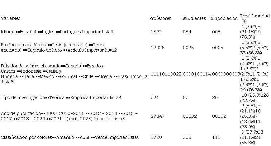 De la búsqueda, se tomaron en cuenta 38 documentos como unidades de análisis, cuya descripción se puede revisar en el Apéndice A. Al organizarlos, se clasificaron en dos categorías iniciales de contenido: estudios sobre GNE con el profesorado de matemáticas como población (28 documentos) y estudios con otras poblaciones, estudiantes en diferentes niveles educativos, que hacen referencia a la población docente en sus problemáticas, discusiones y/o prospectivas (7 documentos). Sin embargo, ya que algunos documentos no aplicaban a esta clasificación, los documentos que reportan revisiones de literatura o reflexiones teóricas (3 documentos), se creó una tercera categoría denominada Sin población (ver Tabla 1).