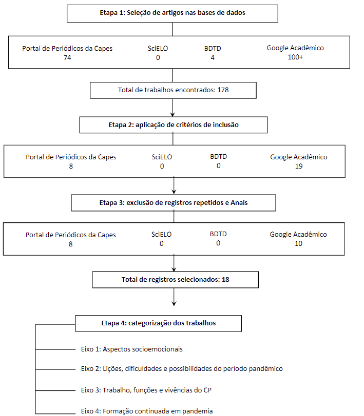 Nos limites deste estudo, a pesquisa mapeou as produções em língua portuguesa sobre o trabalho do coordenador pedagógico durante a pandemia de Covid-19 publicados entre os anos de 2020 e 2022 (consulta final realizada em 27/07/2022). Muito embora as revisões sistemáticas costumem se referir a períodos mais longos (cinco, dez ou vinte anos de produção científica), a pandemia de Covid-19 teve início, no Brasil, em março de 2020, o que justifica a delimitação de tempo aqui proposta.