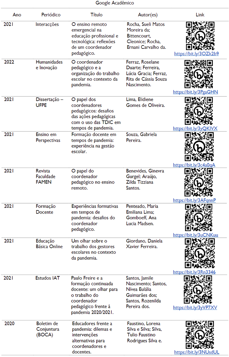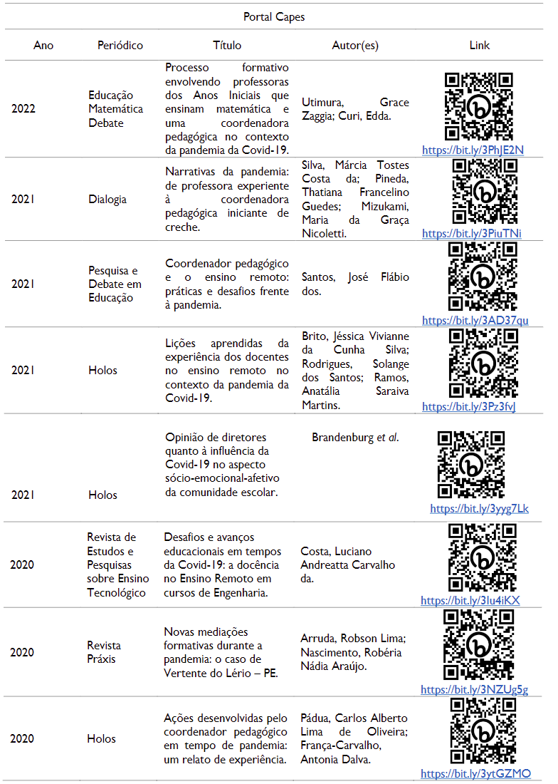 O Portal de Periódicos da Capes, no entanto, rendeu busca frutífera: utilizando as mesmas palavras-chave, o site apontou um total de 74 resultados. Destes, nem todos se encaixavam nos critérios de inclusão da pesquisa – período de 2020 a 2022; artigos, dissertações e teses; referência à atividade da coordenação pedagógica na pandemia - logo, foram selecionados apenas 8.