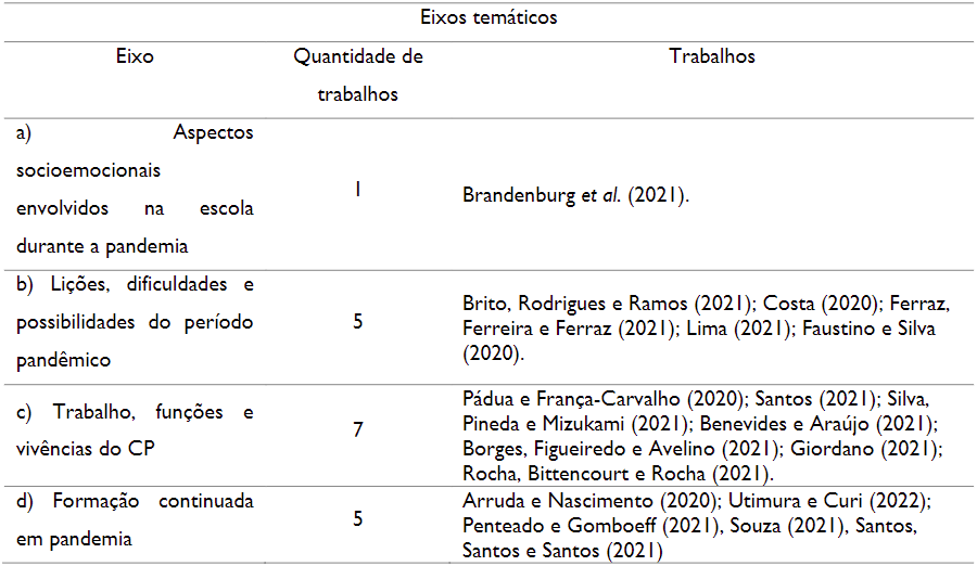 O esforço de categorização temática dos trabalhos encontrados foi pautado na análise de conteúdo (Bardin, 2002) com o objetivo de sistematizar as produções e as leituras, de forma a enxergar, de maneira mais abrangente, as principais abordagens para o tema pesquisado: o coordenador pedagógico na escola durante a pandemia de Covid-19. Entende-se que as fronteiras delimitadas entre os eixos temáticos são linhas tênues que podem se intercalar facilmente, entretanto, foi privilegiada a maior inclinação dos trabalhos para algum dos eixos identificados.
