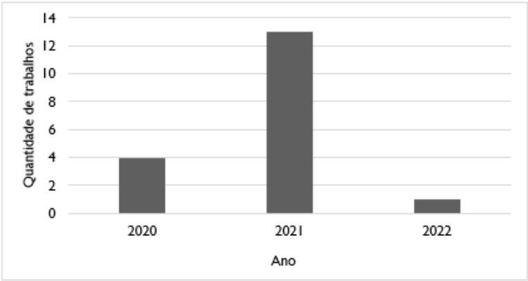 A leitura e análise dos trabalhos encontrados permitiram observar que a grande maioria dos resultados é formada por artigos em revistas acadêmicas, sendo apenas uma (1) dissertação3. Ao aglutinar os resultados levando em consideração seu ano de publicação, percebeu-se que a maior parte foi publicada no ano de 2021, com treze (13) trabalhos. O ano de 2020 teve quatro (4) trabalhos e, 2022, apenas um (1) trabalho. Essa divisão por ano, evidenciada na Figura 2 (abaixo) e com maior incidência em 2021 parece ser pertinente quando se leva em conta o início da pandemia no Brasil, em março de 2020, o que proporcionou tempo necessário para trabalhos publicados no ano seguinte com observações e coleta de dados também no ano anterior.