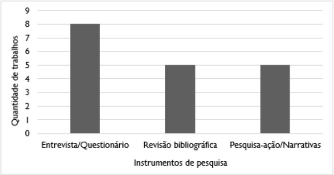 Outro aspecto analisado foi a metodologia empregada nos estudos. Em sua maioria, os trabalhos fizeram uso de questionários ou entrevistas como principal meio de coleta de dados, totalizando um total de oito (8) trabalhos. Outros cinco (5) trabalham principalmente com revisão bibliográfica e os cinco (5) demais trabalhos elegeram pesquisa-ação, relato de experiência ou narrativas como sua principal forma de pesquisa. Estes instrumentos de pesquisa são coerentes com uma perspectiva interessada no universo de múltiplos significados, práticas, sentimentos, aspirações etc. a partir do ponto de vista dos coordenadores pedagógicos (Minayo, 1997; Lüdke; André, 2018). A Figura 3 evidencia os instrumentos de pesquisa utilizados na pesquisa.