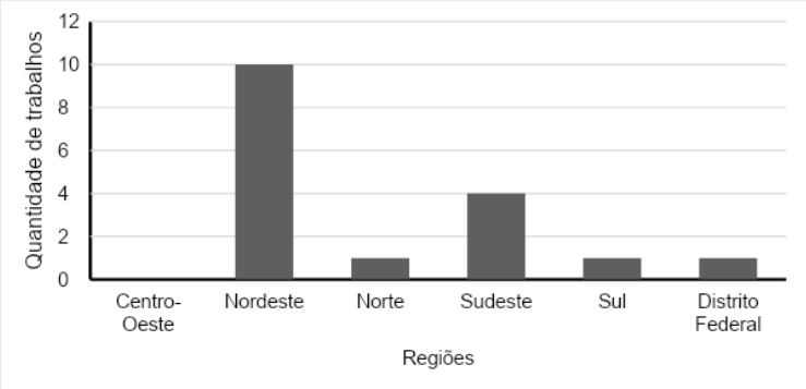 No que toca a distribuição geográfica dos trabalhos encontrados, a maioria foi publicada em periódicos da região Nordeste do país, que conta com dez (10) trabalhos, seguido pela região Sudeste, com quatro (4). As regiões Norte e Sul e o Distrito Federal também contêm, cada, um (1) trabalho publicado. A região Centro-Oeste não apresentou publicações concernentes ao tema desta pesquisa. Tal distribuição pelas regiões brasileiras está evidenciada na Figura 4. A preponderância de resultados da região Nordeste contrasta com a pesquisa de Geglio (2016), que mapeou produções focadas no Coordenador Pedagógico no período de 1987 a 2009 e encontrou mais resultados nas regiões Sul e Sudeste, justificadas pelo desenvolvimento econômico dessas regiões.