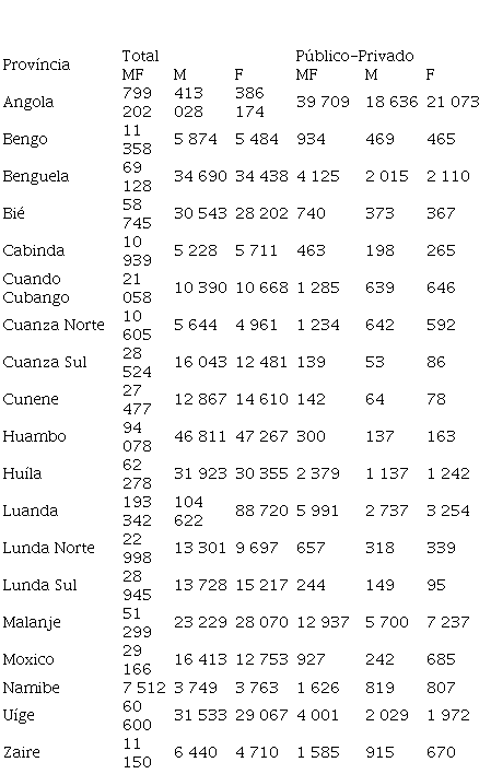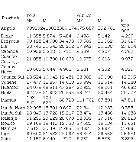Na Tabela 2, consta o número de alunos matriculados na classe de iniciação no setor público- privado e distribuídas em função sexo. Ainda se verifica que a maioria desses, estão concentrados nas províncias de Luanda, Benguela, Huambo, Huíla, Bié e Uíge.