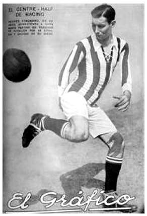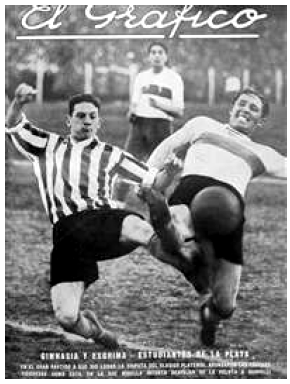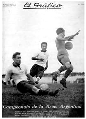 Existieron muchas variantes de situaciones deportivas futbolísticas generadas en las tapas de la revista El Gráfico: desde la "típica" pose del futbolista pateando, cabeceando o deteniendo una pelota, pasando por el retrato del rostro, el medio cuerpo o el cuerpo entero, los clásicos fotomontajes de un jugador de fútbol realizando algún gesto técnico complejo (figura 14) o desafiando a otro jugador de fútbol, las habituales escenas de los protagonistas parados, sentados o en cuclillas hasta los típicos "testimonios" fotográficos de un partido o imágenes acriolladas, aporteñadas y argentinizadas de los grandes ídolos del fútbol local (figura 15). La mayoría de las secuencias deportivas fueron retratos que acentuaron el rostro o el cuerpo entero del jugador. Además, la identificación del jugador y el club fue el tono dominante. Las imágenes fotográficas y los fotomontajes de las portadas combinaron diferentes espacios: ciertas zonas de la canchas de fútbol (cerca del arco, del córner, del mediocampo, entre otros), tribunas de estadio, planos de la vida cotidiana e, inclusive, imágenes sin un fondo definido. Asimismo, la pelota y la vestimenta (del club o de la selección argentina) formaron parte del ambiente previamente fabricado y fueron los grandes significantes de la esfera deportiva. En especial el fútbol, a partir de las páginas de El Gráfico, colaboró en la construcción y cohesión de la "comunidad imaginada" moderna argentina y, al mismo tiempo, fomentó un particular relato sobre las habilidades y potencialidades de "lo criollo" (un ideal corporal basado en la descendencia de españoles e italianos), sobre o contra el modelo anglosajón: "El imaginario del estilo de fútbol criollo opuesto al británico no es solo creación de la prensa argentina sino también de la inglesa local que, continuamente, opone el estilo británico asociado al sentido táctico, la disciplina, el método, la fuerza y el poder físico, a las virtudes criollas, basadas en la agilidad y en la virtuosidad de los movimientos" (Archetti, 2005, p. 4).