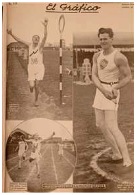 En tercer lugar, esta diversidad de espacios, materiales deportivos, universos kinésicos, gestos técnico-deportivos y protagonistas presentó algunos patrones comunes. La mayoría de los varones expuestos fueron jóvenes, blancos, delgados, estilizados, aseados, con cierto reconocimiento social, con una apariencia "saludable" y con un porte corporal que transmitió ciertos valores morales vinculados con el esfuerzo, el valor, la dedicación, el riesgo, el carácter y la disciplina. Además, de entre la pluralidad de deportes que emergieron en las tapas (la lucha, el rugby, el waterpolo, el esquí, el automovilismo, el ciclismo, el básquetbol, el tenis, el fútbol, el remo, el yating, el atletismo, la natación, el box y la aviación), los últimos siete tuvieron más de una aparición, y se destacaron, con mayores presentaciones, el atletismo, la natación, el box y la aviación. En varias ocasiones, las representaciones deportivas de la natación o el atletismo estuvieron acompañadas de breves epígrafes ("Luis Suarez, 800 metros llanos en 2',2" 3/5", "Abelardo Piovano, 200 metros llanos en 22 segundos", "Jorge Llobet Cullen, bala 12 metros, martillo 37 metros y medio"), los cuales promocionaron, junto con el esfuerzo físico extremo, la idea de récord (argentino, sudamericano o internacional) a partir de números que sintetizaron la obsesión por la eficacia, la eficiencia y la cuantificación del rendimiento físico y sus múltiples e infinitas posibilidades (figura 4). Lentamente el universo de los números y cifras tradujo el éxito físico-deportivo masculino nacional, y se convirtió en un dato insoslayable del plano deportivo moderno.