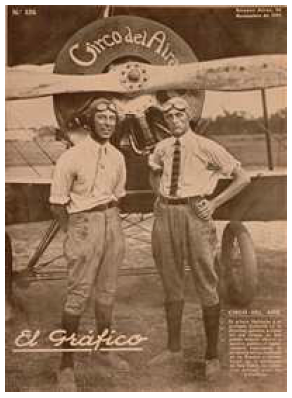 La aviación merece una mención particular. La misma fue una de las actividades con mayor presentación en portadas en este período. En ocasiones la escena cuasi-deportiva o, en ciertas circunstancias, recreativa o relacionada con el pasatiempo, puso en circulación sentidos asociados con los desafíos extremos, los retos mortales, las proezas impensadas, las pruebas imposibles, el riesgo inconmensurable y el espectáculo como, por ejemplo, el caso de los aviadores acróbatas Max Holtzem y Eugen Geberth quienes, en uno de sus tantos y peligrosos actos acrobáticos, perdieron la vida en un accidente aéreo. La relación entre la máquina, la tecnología, el riesgo, la aventura, la virilidad y el desafío físico fue una de las problemáticas más exhibidas y estimuladas en este período en las carátulas de El Gráfico (figura 5).