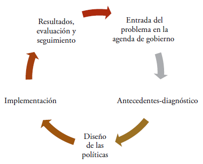 En cuanto al análisis de la respuesta del Gobierno para atender la continuidad educativa a distancia, se utilizó el "ciclo de las políticas públicas" como un modelo de análisis que permite esclarecer las distintas etapas o fases de las intervenciones de gobierno y, en última instancia, develar su eficacia, eficiencia y pertinencia -o su falta de ellas- (Aguilar, 2010). Se trata de un esquema que identifica que las intervenciones de política educativa tienen diversas fases o momentos interconectados e, idealmente, coherentes entre sí, que forman un "ciclo" (Aguilar, 2010). Aunque, en la realidad, estas fases no se siguen, necesariamente, en un orden lineal, considerarlas así permite aproximarse de manera sistemática a una política educativa (Aguilar, 2010; Merino & Cejudo, 2010). El ciclo de políticas permite develar que toda intervención tiene sus antecedentes en otras decisiones y acciones de gobierno -impulsadas por las mismas autoridades o por las correspondientes a otro período-, y parten de la entrada a la agenda de gobierno de un problema público, de cuyo diagnóstico depende el diseño de las intervenciones que le darán respuesta y que se implementarán, con los resultados deseados -o no-, los cuales, a su vez, podrán ser evaluados y monitoreados por los integrantes de la sociedad civil, pero también por el Gobierno, para continuar, desechar o reformular la intervención de política en cuestión (véase la figura 1).