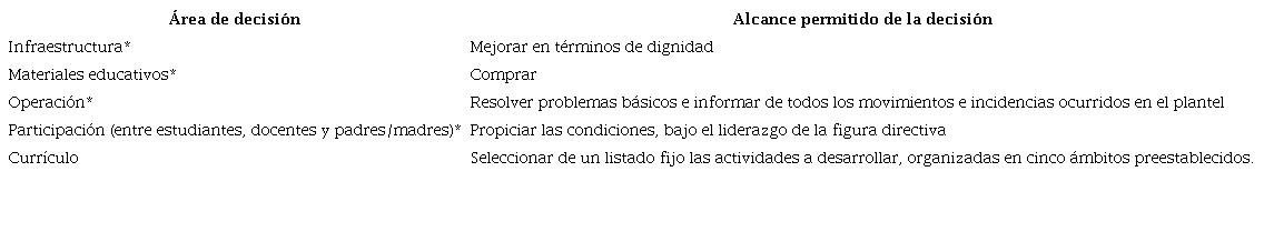 Las palabras del jefe de Estado, así como los cambios realizados a la Ley General de Educación (LGE-2013) y lo plasmado en otros documentos de política (Acuerdo 717; NME; PSE 2013-2018), permiten vislumbrar a la autonomía de gestión como un elemento clave para la mejora de la calidad educativa, así como identificar las áreas sobre las que se otorgó -mayor o menor- permiso formal para que las comunidades escolares tomaran decisiones, siempre que se cumpliera con una normalidad escolar mínima (véase la tabla 1):