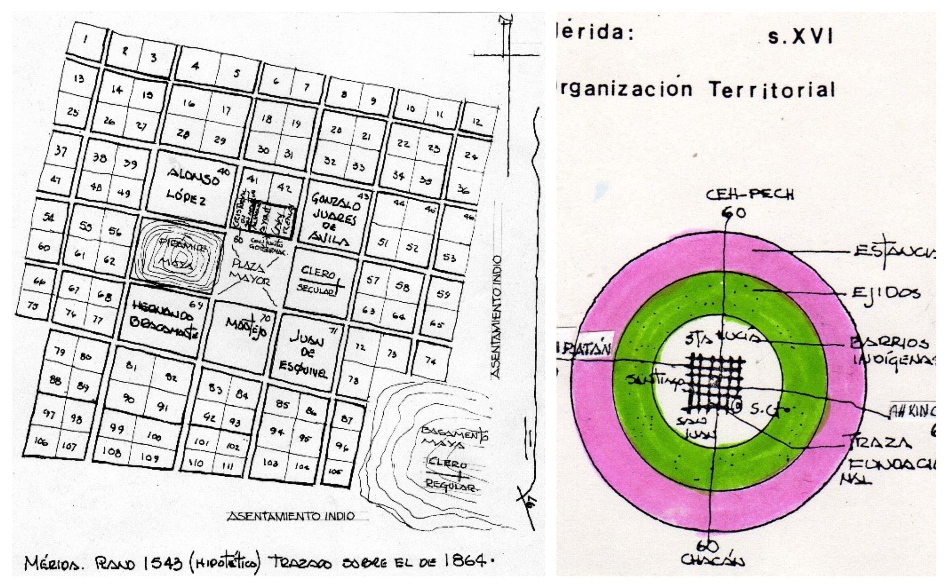 Del período colonial, el esquema de trazo urbano español se sobrepuso a la estructura de la ciudad maya muy diferente, misma que no pudo ser borrada del todo, y el resultado fue una morfología híbrida que revela la sobreposición cultural ahí operada cuando los colonizadores ocuparon y levantaron sus primeras edificaciones. La ciudad maya se nucleaba y articulaba en torno a enormes edificaciones construidas sobre plataformas “i” orientadas según los astros.