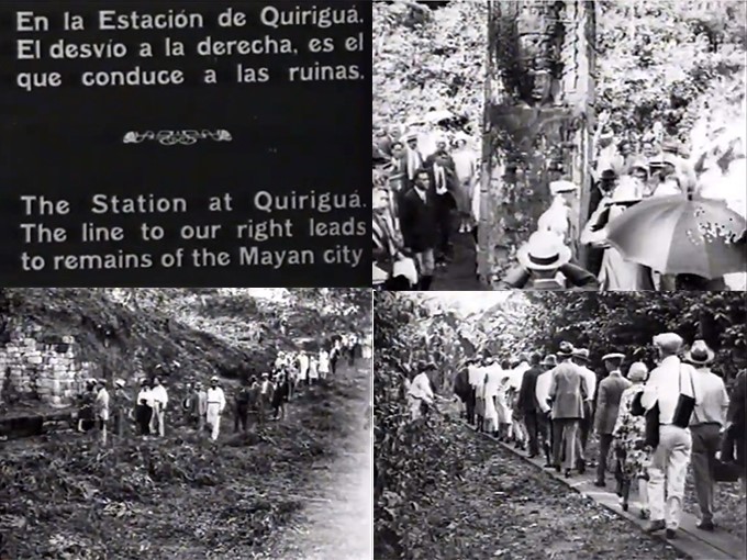 De hecho, gracias a la digitalización del archivo de Historia del Cine Guatemalteco en 2007, puede disfrutarse del interesante testimonio en movimiento titulado Excursión de la Sociedad de Geografía e Historia a Quiriguá y el Río Dulce en 1927. En efecto, el sitio despertaba el interés de la sociedad, incluso más allá de sus fronteras. Las imágenes muestran lo que entonces debió ser todo un evento social y reflejan la curiosidad que existía por las ruinas. En ellas se puede apreciar cómo el Licenciado Villacorta acompaña a un grupo de 156 visitantes a los que narra las grandezas de la antigua civilización maya. Estas imágenes, aunque lógicamente pobres en resolución, permiten distinguir los primeros intentos de puesta en valor del sitio arqueológico, apreciándose una incipiente senderización (Figura 8).