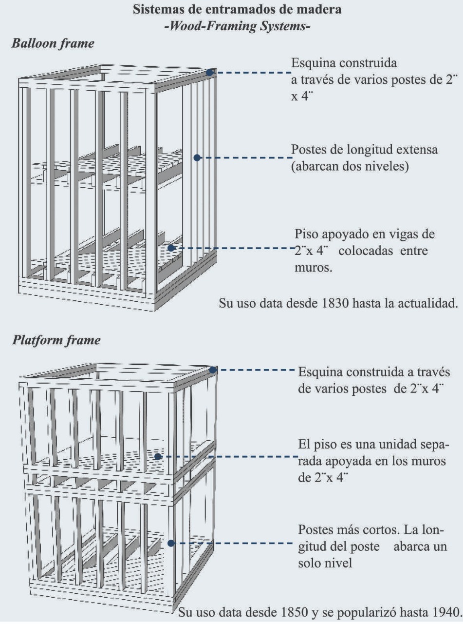 El balloon frame consta de una estructura principal a base de listones de madera unidos por clavos, y contempla numerosas piezas que permiten su fácil y rápida construcción. El platform frame se reconoce como una “estructura de entramado sin rigidez, con la adición de una plataforma que eleva el volumen del edificio del nivel de piso. Ambas técnicas fueron producto de importación y actualmente su uso es frecuente en los Estados Unidos. No obstante, al no poseer la materia prima, en México sólo se observan en aquellas viviendas que fueron construidas desde principios del siglo XIX, hasta mediados del siglo XX. (Figura 5)