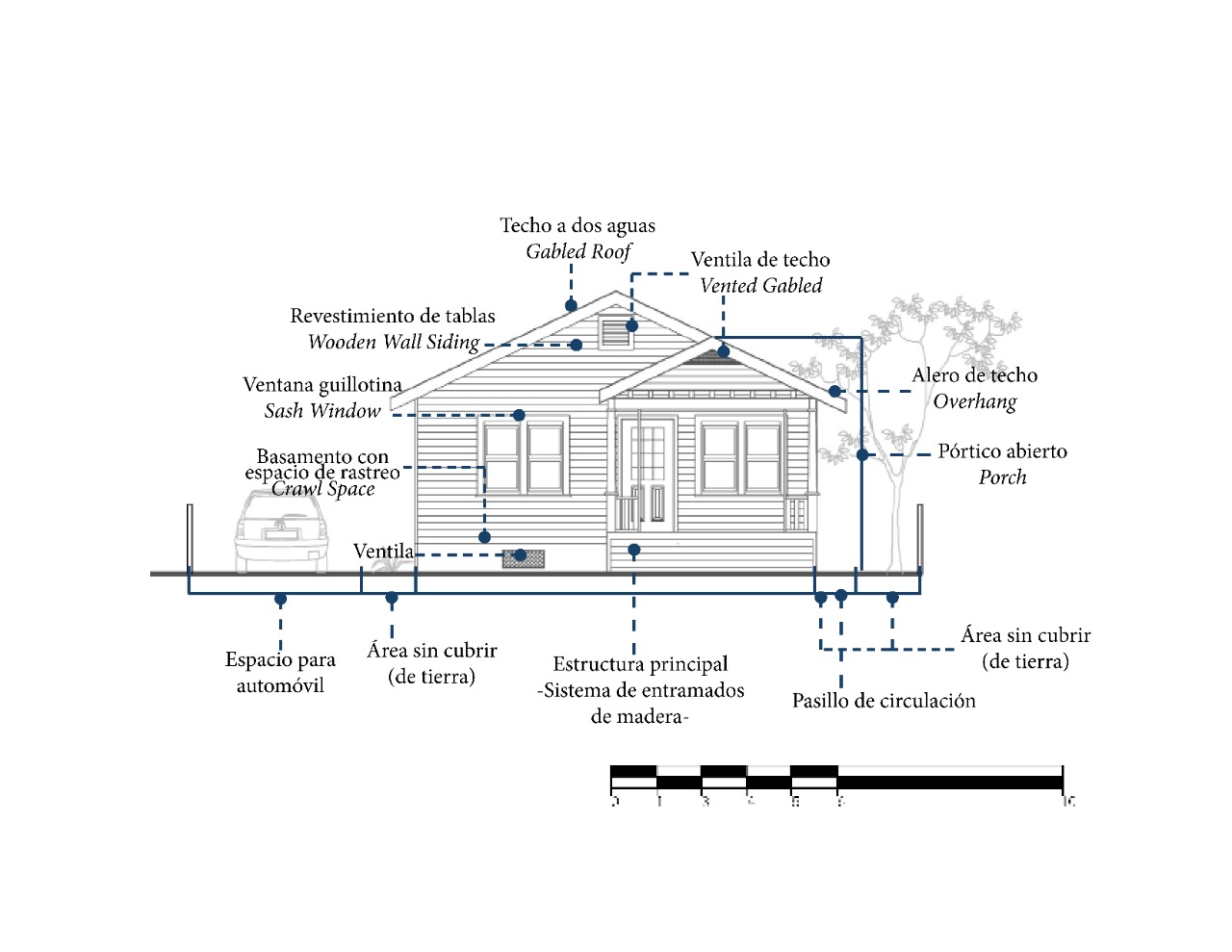 Finalmente, los revestimientos en el bungalow son a menudo tablas ligeramente espaciadas, acomodadas y clavadas en vertical y horizontal sobre los marcos de la estructura. Además de ser una envolvente que ayuda a regular la temperatura y humedad interiores, estas tablas funcionan como tirantes que contrarrestan las fuerzas laterales del viento y los sismos.