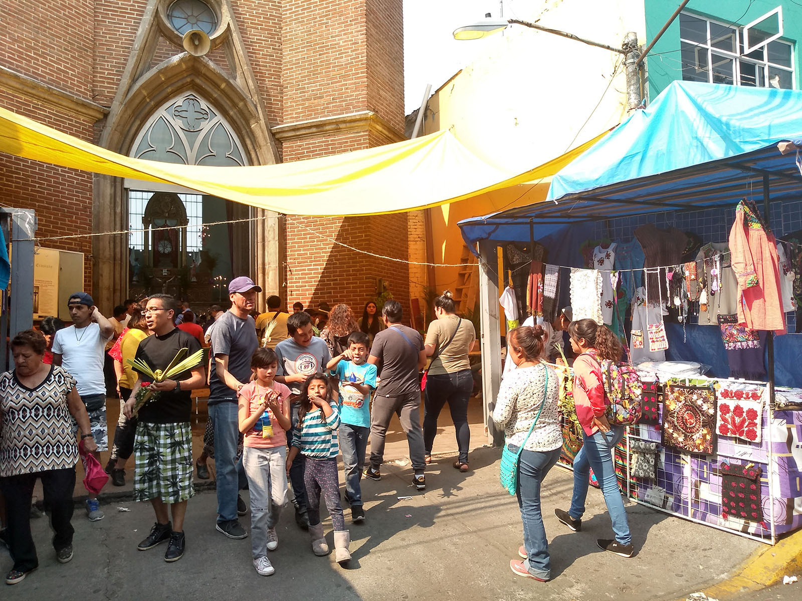 Figura 6. Puesto de artesanías al exterior de la Capilla de San Pablo el Ermitaño (CDMX) durante la celebración del domingo de ramos, 2019. Fotografía: Samantha Pantoja Hernández, (2019).