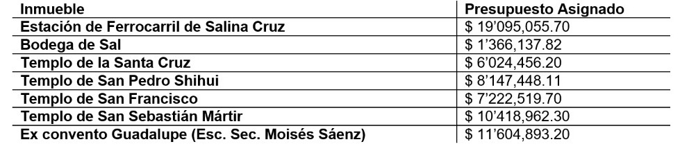 Como se había adelantado, la póliza del INAH tuvo la posibilidad de responder por los daños de aquellos monumentos asegurados; sin embargo, los monumentos que contaban con reconocimiento de la Secretaría de Cultura sin cobertura de seguro se incorporaron para ser atendidos con recursos del FONDEN. Los bienes de propiedad federal o nacional 100% FONDEN, y los de propiedad estatal 50% FONDEN y 50% recursos estatales. Fue así que, a través del esquema de recursos descritos de manera general, con el Taller Mexicano de Supervisores de Obra S.A. de C.V se logró intervenir inicialmente 12 inmuebles repartidos entre los Valles Centrales y el Istmo de Tehuantepec