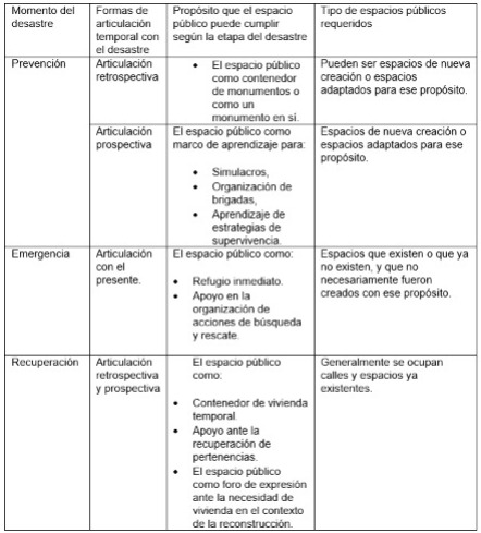 A partir de la segunda década del siglo XXI, una creciente literatura se ha estado concentrando en el rol del espacio público en el contexto de desastres (Wei, et al., 2020; French, et al., 2019; y Koren & Rus, 2019). Por un lado, dichas investigaciones no se han producido desde un solo campo, sino que ha sido necesario un abordaje desde varias disciplinas, incluyendo principalmente el diseño urbano y el diseño de paisaje (Allan et al., 2013); el análisis espacial (Villagra, et al., 2014) y la planificación de la recuperación ante desastres (Dionisio et al., 2012). Tomando como marco interpretativo este último campo, puede decirse que las investigaciones sobre el tema comenzaron enfocándose en las funciones del espacio público en la etapa de emergencia y recuperación después de sismos, y posteriormente el interés se fue dirigiendo gradualmente hacia el rol de dichos espacios en una etapa de prevención (Baskaya, 2015), lo que a la fecha permite esbozar con mayor detalle la relación que guarda el espacio público con cada uno de estos momentos del desastre (ver Tabla 1), entendido este no como un evento único crítico, sino como la materialización de un riesgo construido en el tiempo y con factores causales en el pasado (Oliver-Smith et al., 2016), lo que demanda acciones en el presente para anticipar una respuesta y una recuperación en el futuro. Y son estas temporalidades la que nos permitirían concebir y proponer la naturaleza del espacio público bajo dos formas de articulación con respecto a la vida de la ciudad en riesgo. La primera sería una articulación retrospectiva, en donde el espacio público es el marco y vehículo para mantener viva la memoria del desastre y el recuerdo de la pérdida. A esta categoría podrían pertenecer tanto los espacios que ya existían en el momento del desastre, como aquellos creados para ese fin; segundo, una articulación prospectiva, donde el espacio público es concebido como un espacio de aprendizaje permanente ante la emergencia a futuro, y como un refugio adaptable, a donde pertenecerían tanto los espacios de nueva creación, como los adaptados para este fin. Dentro de esta categoría, el espacio público no solo representa un soporte físico en la recuperación, sino que también adquiere un significado en la participación para la garantía de derechos en la etapa de reconstrucción (Berroeta et al., 2016).
