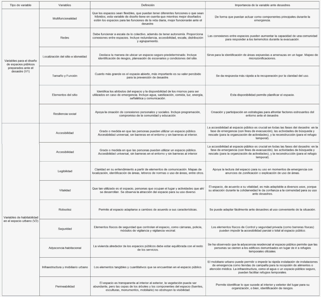 Por su parte, las variables con las que se analizaron los espacios fueron el resultado de sobreponer las variables requeridas para el diseño de espacios públicos preparados para el desastre (V2) propuestas por French et al. (2019), y las variables de habitabilidad (V1) en el espacio urbano (Montejano y Moreno, 2017; De Schiller, 2001). Con ello se obtuvo una sumatoria de los valores -de acuerdo con las variables- por cada espacio, y se consignaron en la tabla mencionada. La descripción de estas variables puede observarse en la Tabla 3.