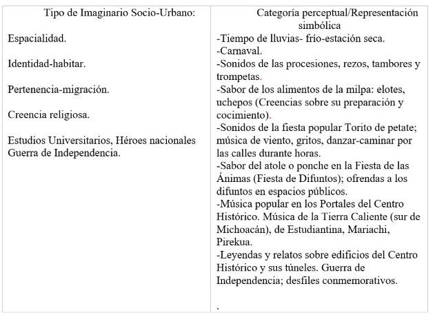 El siguiente trabajo aborda la vida cotidiana, subjetiva, mental, y significante de los habitantes del espacio urbano. En particular, se revisa el caso de una ciudad (Morelia, México), cuyo Centro Histórico, incluído en la Lista Mundial del Patrimonio, es motivo de un acelerado proceso de gentrificación, en el cual persisten los Imaginarios sociales y las representaciones simbólicas de una ciudad virreinal caracterizada por su vocación universitaria, por su Conservatorio de Música, por la vida conventual y sus festividades religiosas y populares, y por el estilo arquitectónico propio de dicho Centro, que le distingue de otras ciudades históricas mexicanas. En este escrito se pretende determinar los Imaginarios sociales que persisten en la ciudad de Morelia. ¿Cuáles son éstos? ¿Cómo demostrar que orientan la percepción? Como recurso metodológico, se planteó elaborar una lista breve de testimonios de personas dedicadas a mantener algunas tradiciones culturales urbanas de dicha ciudad, tratando de determinar, mediante esos testimonios, qué tipo de imaginarios y representaciones socio-urbanas persisten en la zona de estudio.