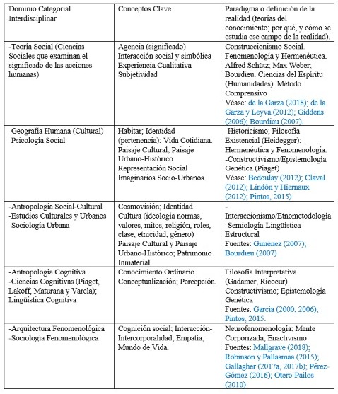 Aún cuando Pintos (Pintos, 2015; Aliaga, 2011) enfatiza que los Imaginarios orientan exclusivamente la percepción, puede observarse que ésta es inseparable del manejo de categorías y conceptos, para traer al plano del discurso lo percibido. Aquí es cuando se acude a las Ciencias Cognitivas, pues su foco de estudios es la relación entre la forma en que la información de lo percibido es registrada en el cerebro, y luego ordenada en categorías lingüísticas y conceptos, o palabras clave. Así, se establece que, si bien dependemos de la actividad de un órgano altamente complejo como el cerebro, también se ha mostrado que el cerebro no podría cumplir su trabajo sin la socialización ni la transmisión cultural, es decir, sin el aprendizaje ni la transmisión cultural de significados. En suma, el cerebro se halla a su vez comprometido en un contexto socio-arquitectónico, ecológico, y cultural, en el cual todos vivimos (Robinson, 2015, p. 3; Pérez-Gómez, 2016, pp. 155, 158, 228, 230; Gallagher, 2017a, pp. 12, 13, 20, 21, 40, 66, 67). Además, en cuanto a las funciones tanto sociales como significantes, simbólicas, y comunicativas, del espacio urbano-arquitectónico, parece válido decir que éstas funciones presentan un reto en la medida que se refieren a la subjetividad humana, es decir, al mundo de los significados, un tema que sólo hasta hace tres o cuatro décadas empezó a tratarse en las discusiones sobre epistemología y metodología de las ciencias sociales (de la Garza, 2012, p. 400; 2018, pp. 17, 22, 57, 58, 63,.175, 176), así como en la Geografía Humana, en su vertiente cultural, constructivista, e interpretativa (Hiernaux & Lindón, 2012, pp. 11, 13; Berdoulay, 2012 pp. 49, 50).