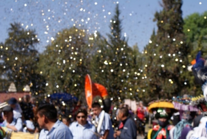 En Xochimilco, el cierre de las calles para dar paso a la procesión, la banda de música y los chinelos, es un acto incomprensible para quien entiende la calle solamente como un soporte para transitar; discusión añeja que al menos desde el siglo XVIII se tradujo en la elaboración de múltiples propuestas que buscaban imponer orden en las actividades que los indios realizaban en la vía pública, y que los españoles y criollos se esforzaban por acotar al espacio privado, y que se tradujeron en Bandos de policía y buen gobierno, Ordenanzas y, finalmente, Planes y programas urbanísticos empecinados en disociar lo público de lo privado, y reservar la calle a la circulación (Pino, 2012). Así, la representación del brinco del chinelo tiene una escenografía móvil, cambiante de procesión en procesión, en la que los elementos de la calle, como los autos estacionados, los cables, así como las banderillas de colores colocadas para el recibimiento del Niñopa, se suman a la procesión del brinco de los chinelos, su indumentaria, y a la música de la banda y los cohetes que rompen con el cotidiano del sonido de los vehículos motorizados y el barullo propio de la calle (Figura 5).